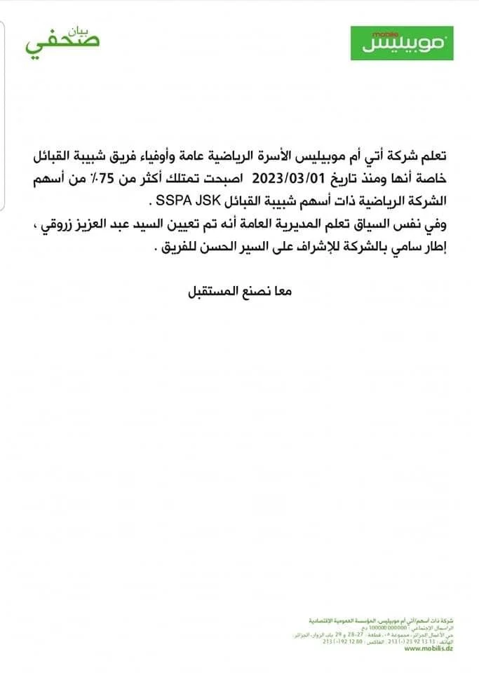 وجاء في بيان الشركة موبيليس:تعلم شركة أتي أم موبيليس الأسرة الرياضية عامة وأوفياء فريق شبيبة القبائل خاصة أنها ومنذ تاريخ 01/03/2023 اصبحت تمتلك أكثر من 75 %من أسهم الشركة الرياضية ذات أسهم شبيبة القبائل JSK SSPA.