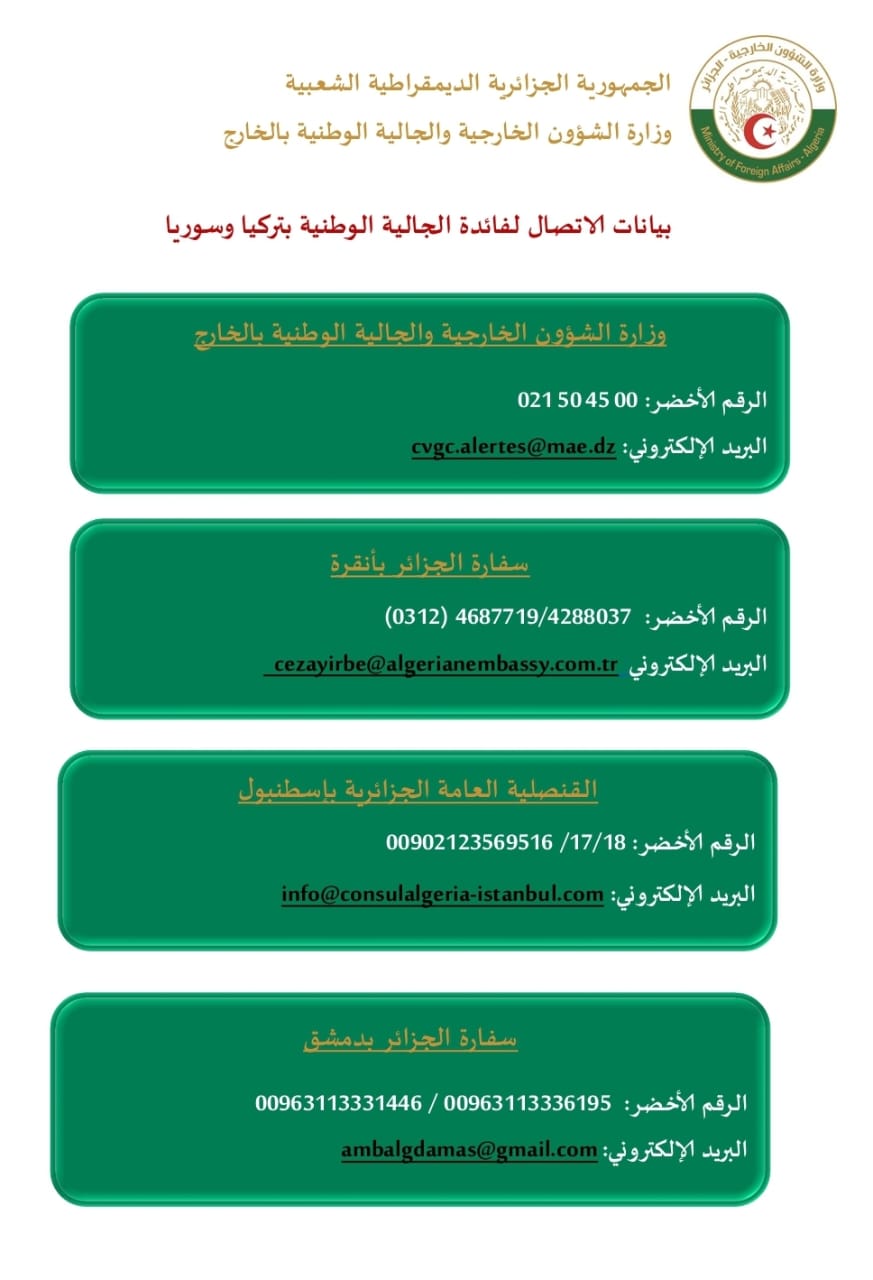 وإذ تطمئن أنه لم يتم إلى غاية الآن الإبلاغ عن تسجيل أي ضحايا أو مصابين بين أعضاء جاليتنا، تهيب الوزارة بالجزائريين المتواجدين بالمناطق المتأثرة بهذه الكارثة مراعاة تعليمات السلامة والحذر الصادرة عن السلطات المحلية. كما تدعو الرعايا الجزائريين إلى البقاء في تواصل دائم مع مصالح سفارتينا في كل من أنقرة ودمشق وقنصلينا العامة في اسطنبول من خلال أرقام الهاتف التالية: